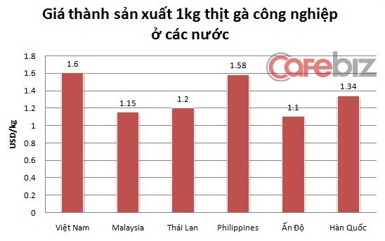 Với các loại thịt lợn, bò, gà công nghiệp, giá thành sản xuất/1kg của Việt Nam cũng cao hơn rất nhiều so với các nước trong khu vực.